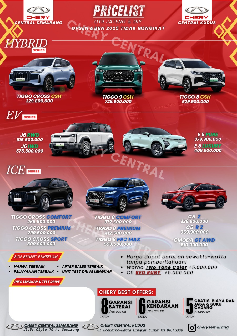 Untuk pricelist resmi Chery Semarang yang lebih detail, sebaiknya kunjungi langsung dealer terdekat atau cek website resmi Chery Indonesia.